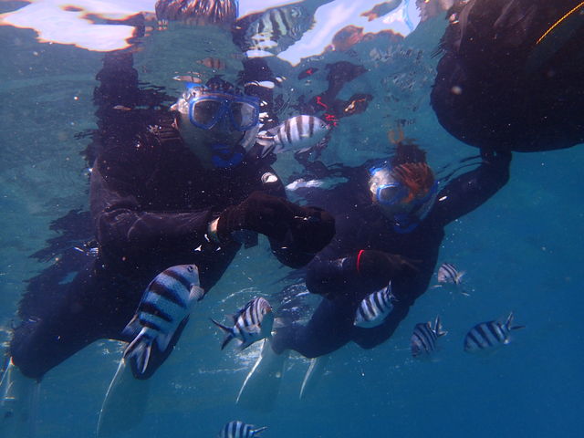 お魚さんに餌をあげる頃には、二人で仲良く、スノーケルを加えながら、会話をしていました(笑)