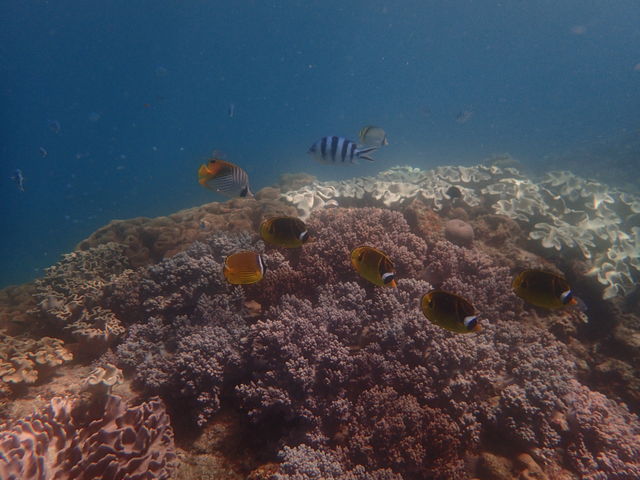 浅瀬から見えるルリスズメダイやツノダシ・数種類のチョウチョウウオなどなど!